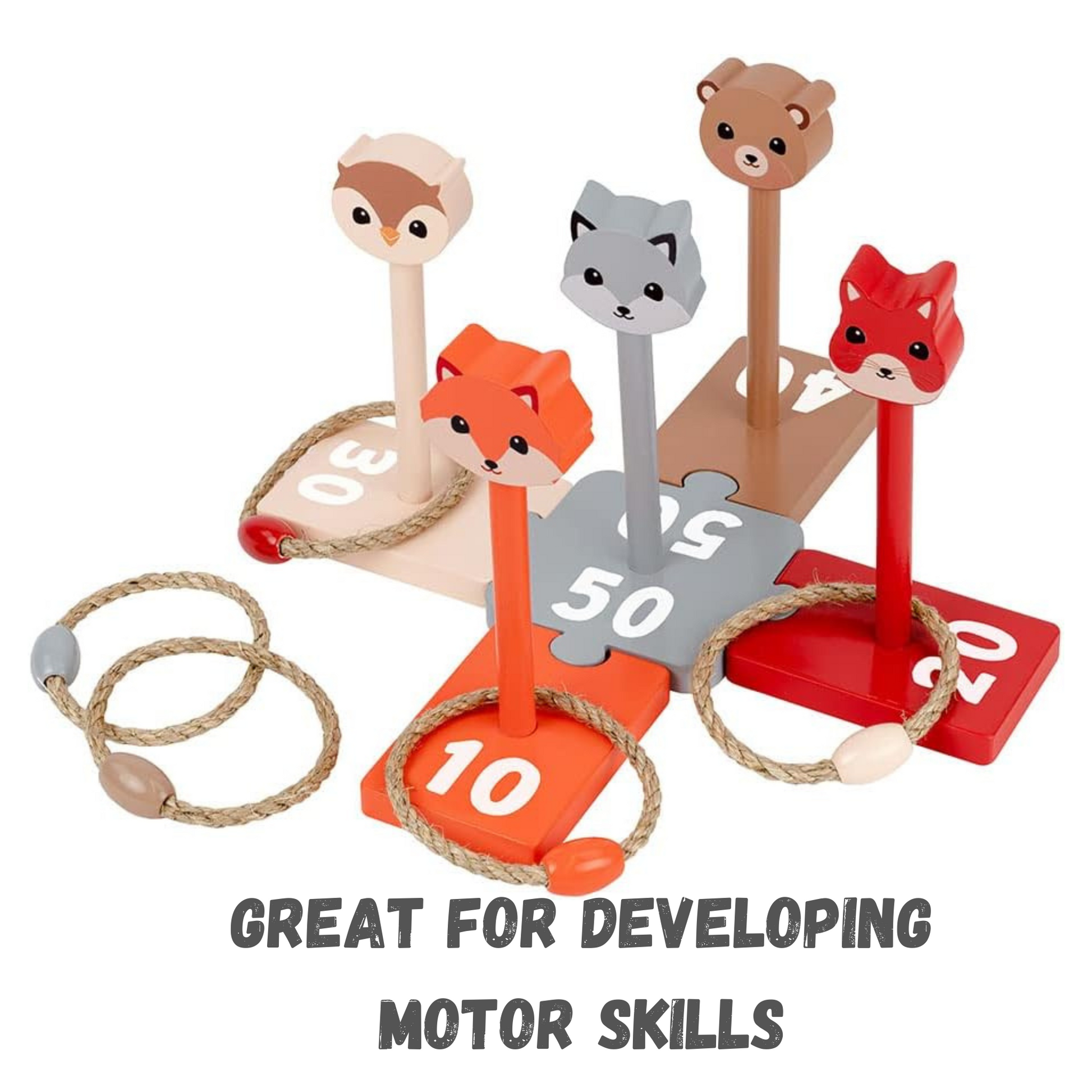 This simple and fun game is a great way to improve hand-eye coordination and fine and gross motor skills while also keeping children amused. Who will win this wild game of aim? So easy to play! Just connect the cheerful animal posts, throw the rings and collect points. Fun for the whole family. For young ones, this will help develop both large and small motor skills. Older children can also practice math and skills by keeping track of the points or by calculating angles, distance and force. Great for play, outside or inside.