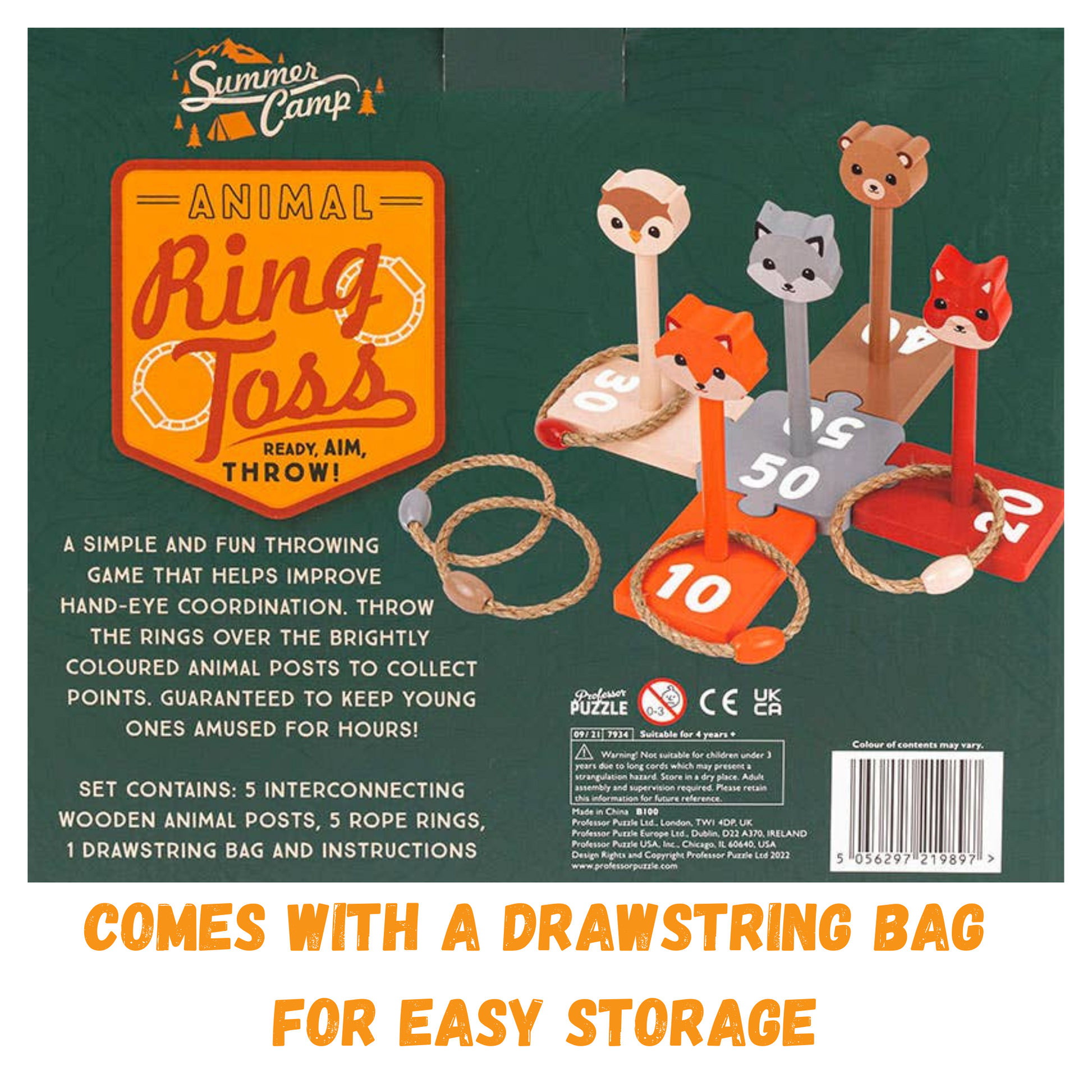 - Set includes 5 interconnecting wooden animal posts, 5 rope rings, and a drawstring bag for easy portability and storage.
