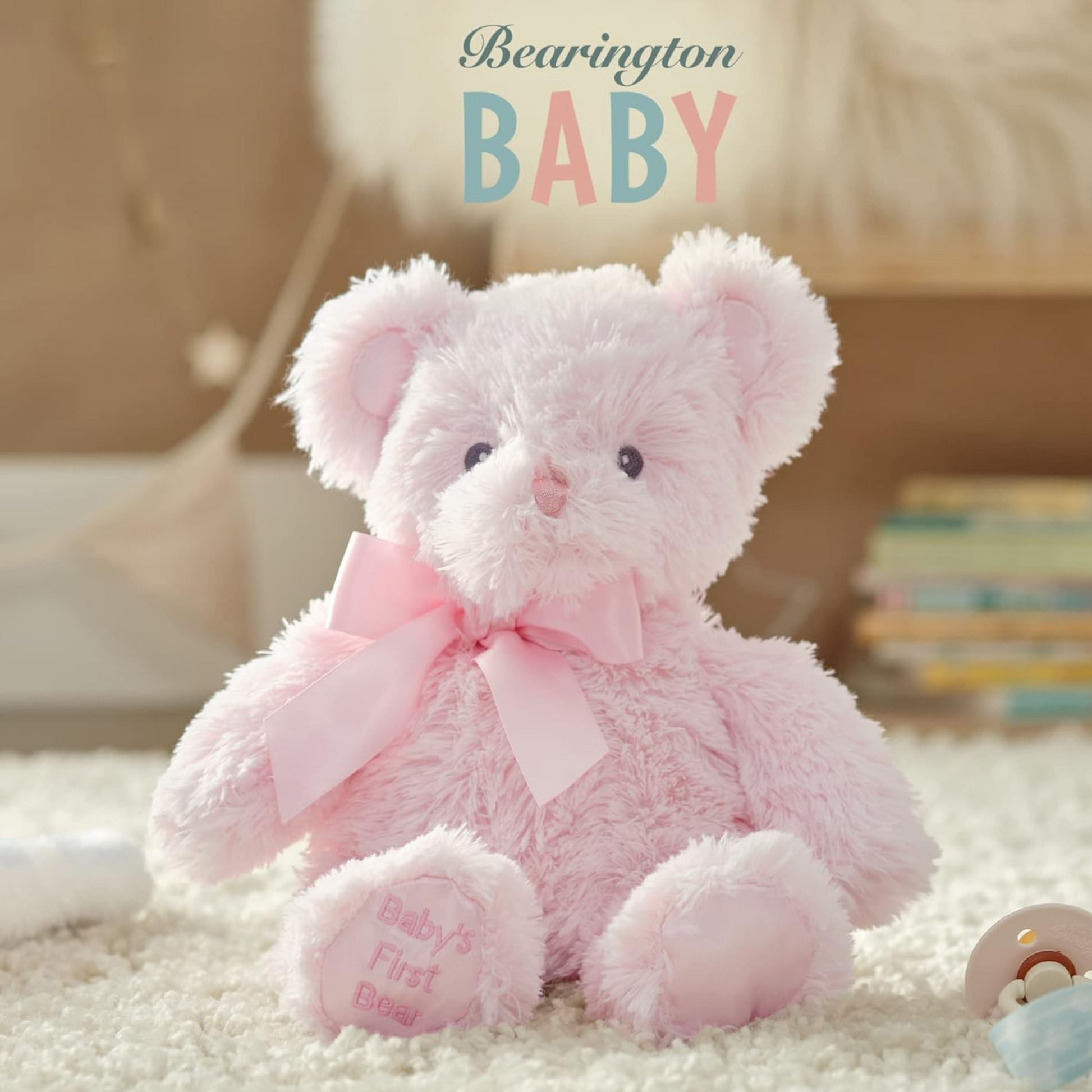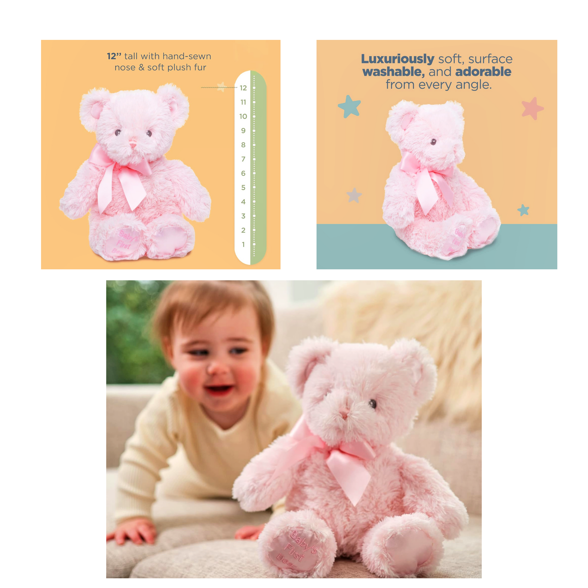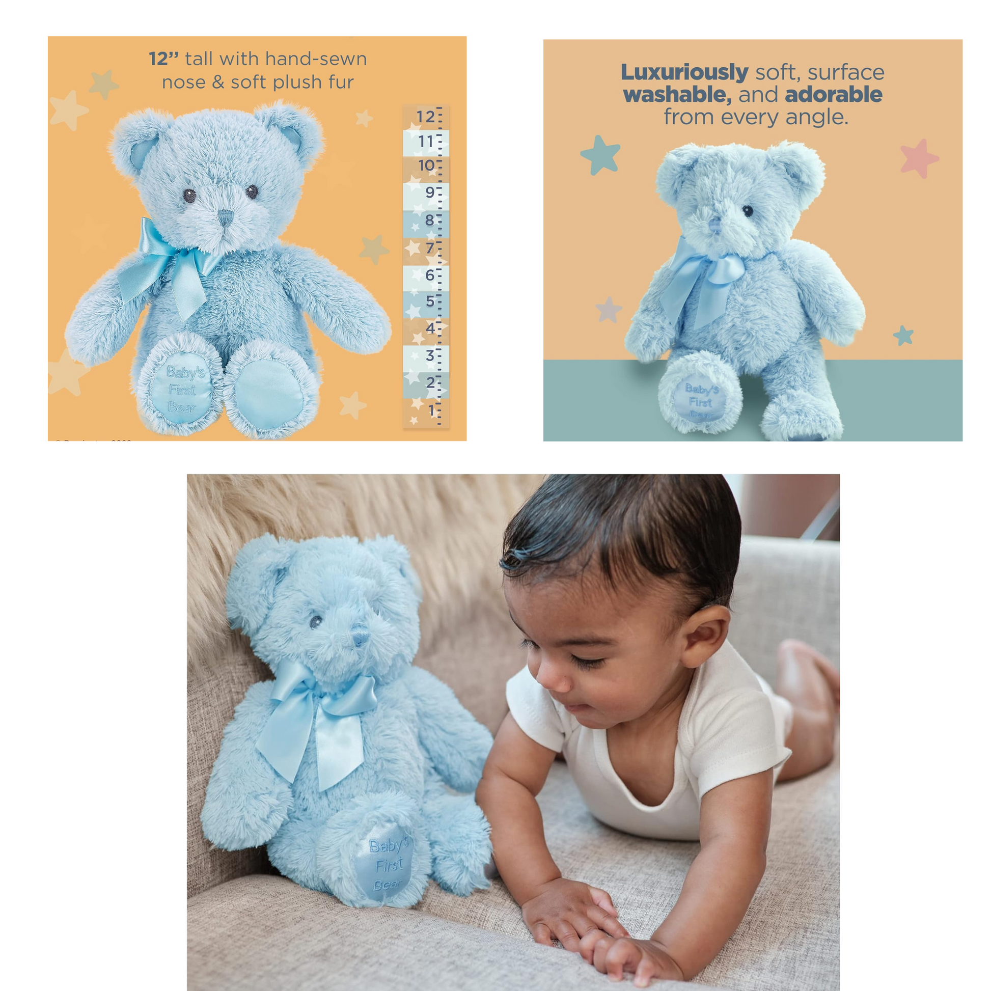 Baby’s First Bear is one of the sweetest gifts that you can give to a newborn baby. This classic, hand-sewn 12inch bear will surely become a cuddly favorite in the crib and well beyond. The premium fluffy, plush and soft fur is gentle not only for a newborn nursery, but as a comforting friend to carry as the child grows. The embroidered facial features are safe, and the silk embroidered foot announcing “Baby’s First Bear” offers a traditional message.