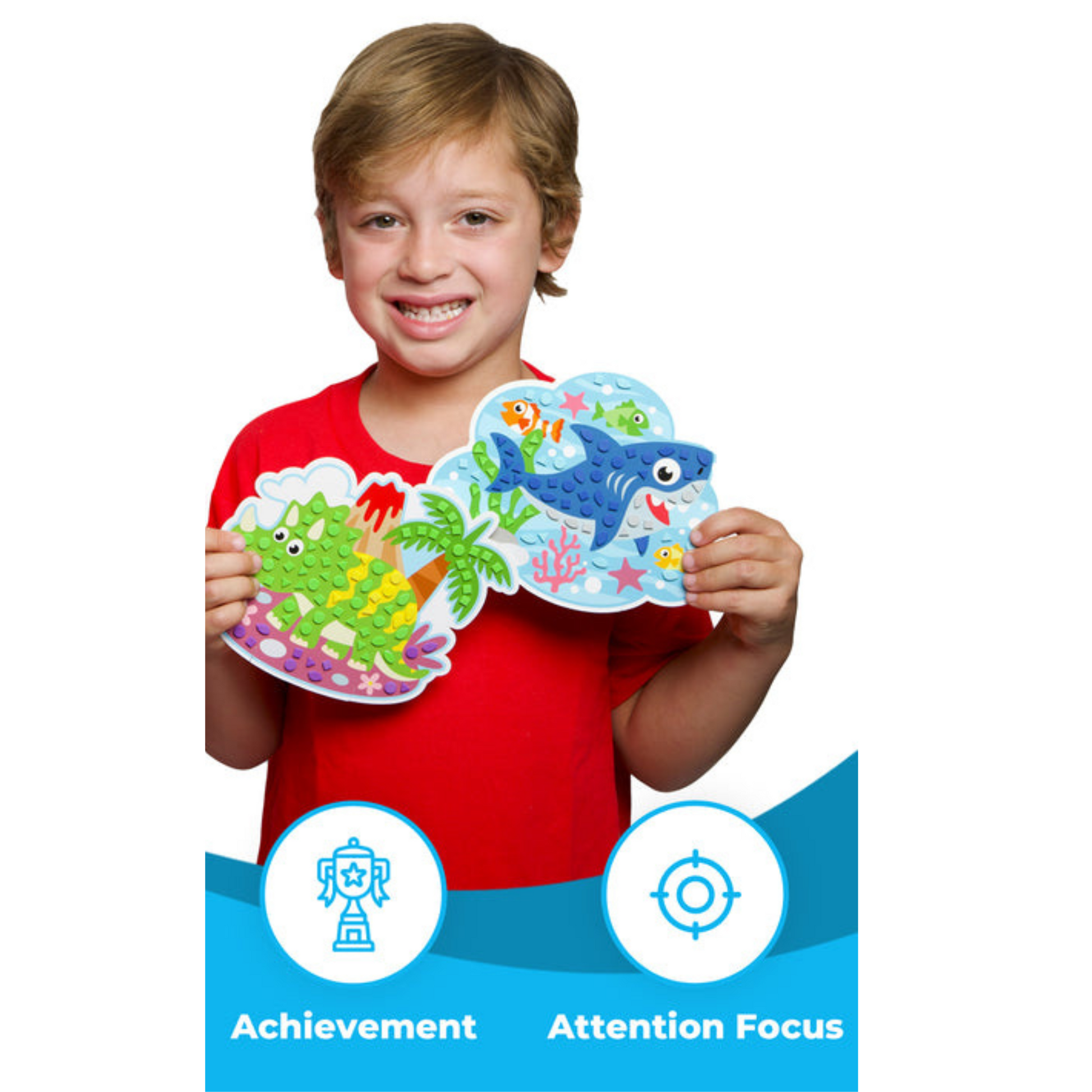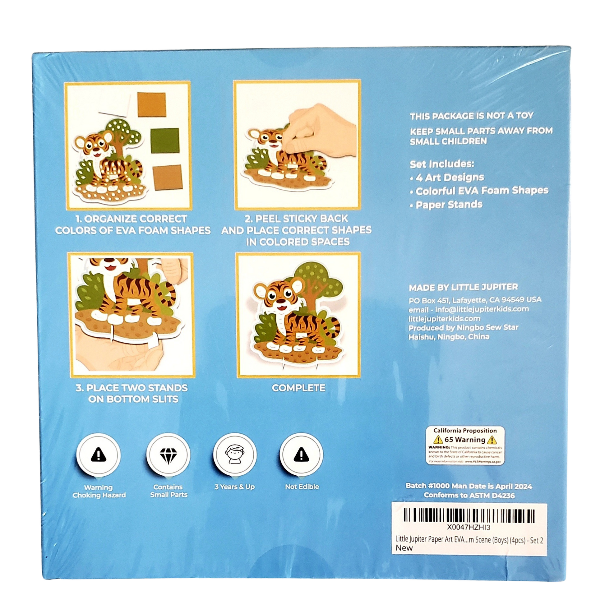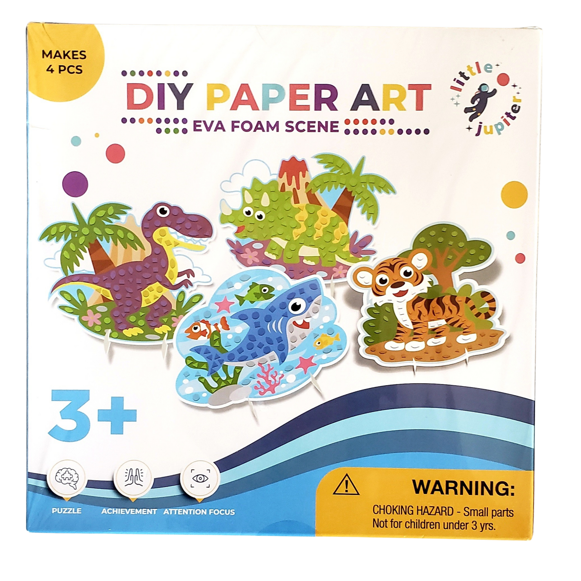 Build-N-Learn: DIY EVA Foam Scene is a great craft for young preschoolers to help understand color, shapes and develop fine moto skills too! Each set comes with 4 colorful whimsical designs including (1) Ocean Life (1) Jungle Animals and (2) Dinosaur scenes. With this kit, children simply stick precut colorful EVA shapes onto a paper design to create a great 3D craft ready for display using the paper stands to help them stand up on their own. A terrific project for poor weather days, after school projects, summer vacation cool down time and more. It could even be used for family engagement time!