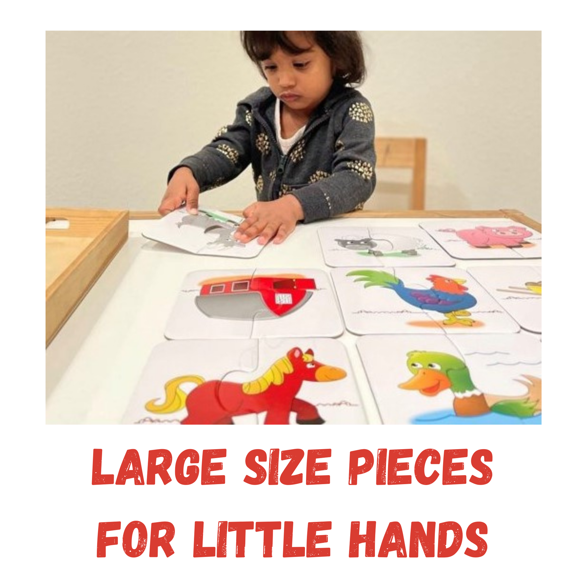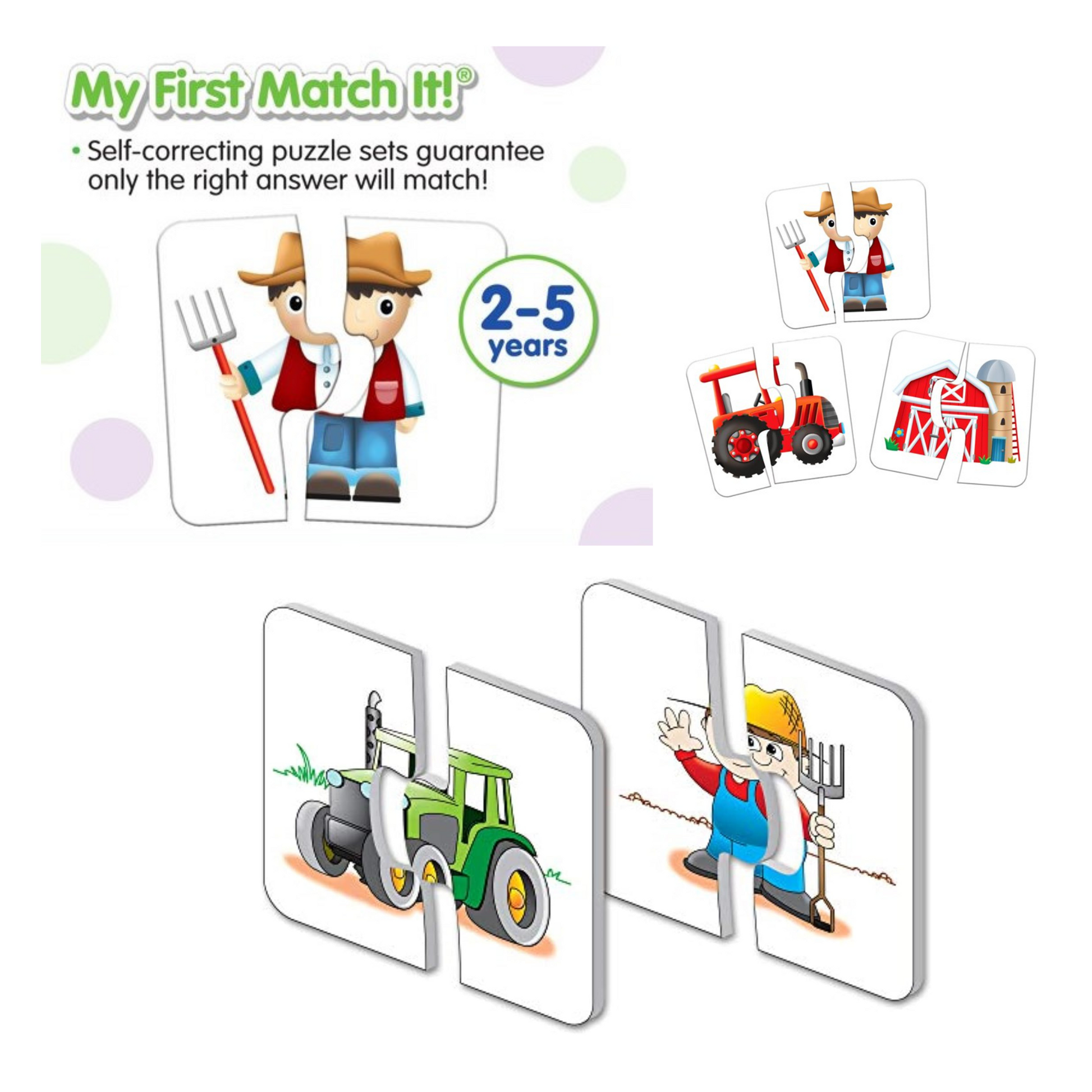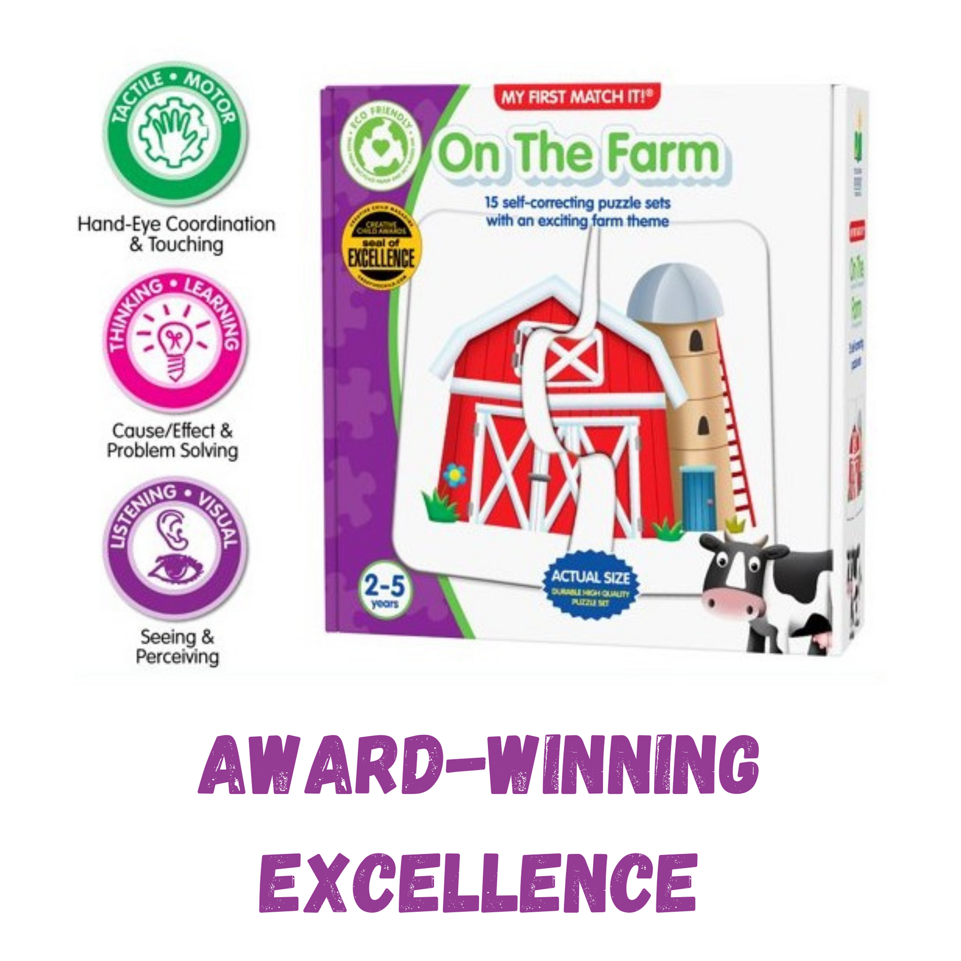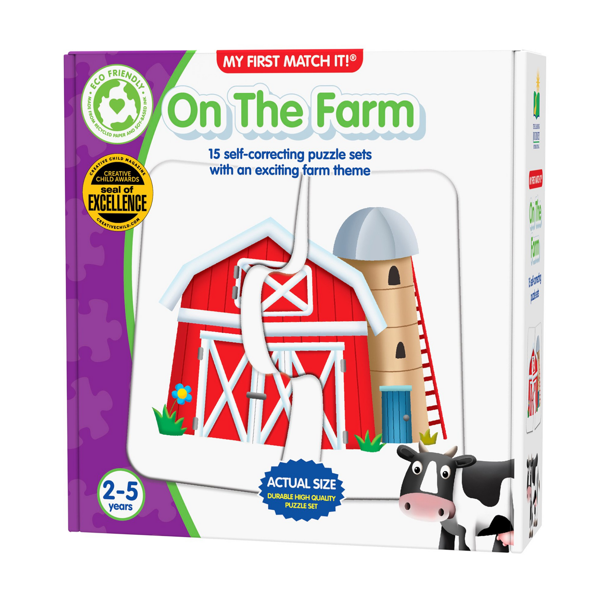 Teaching young children about farms, farming and farm life is easy and fun with this self-correcting puzzle set. These large size, thick cardboard pieces, created for little hands, feature whimsical illustrations of the who and what we might find on the farm. Recognized with a seal of excellence from Creative Child Magazine, this eco-friendly puzzle helps promote tactile motor skills along with problem solving.