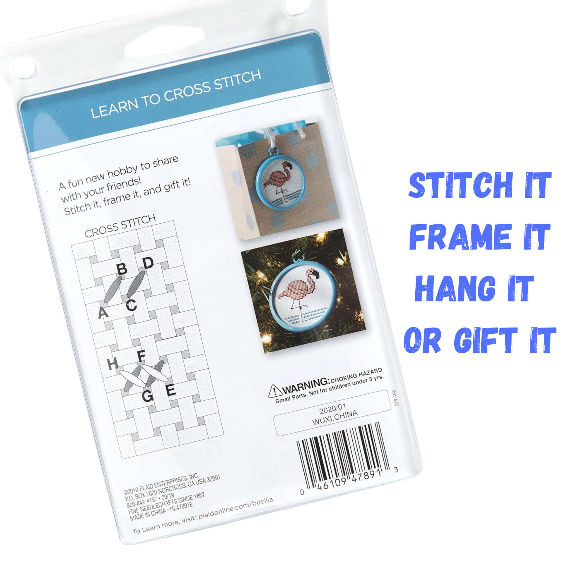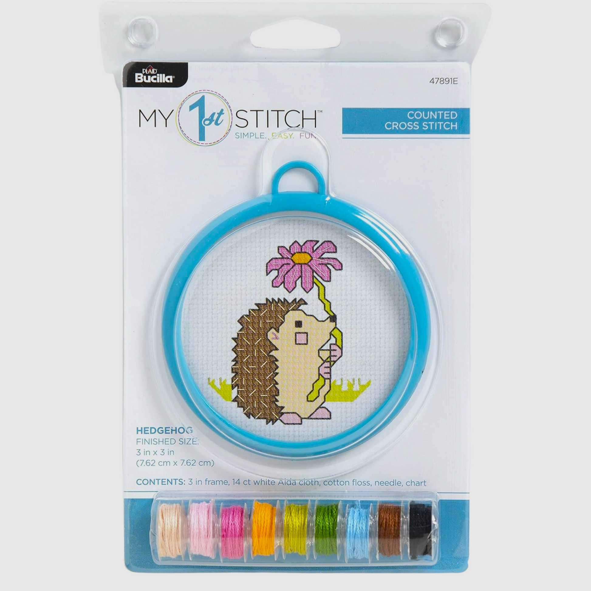 - Kit includes 3 in frame, 14ct white Aida cloth, cotton thread in nine assorted colors, needle and chart.
