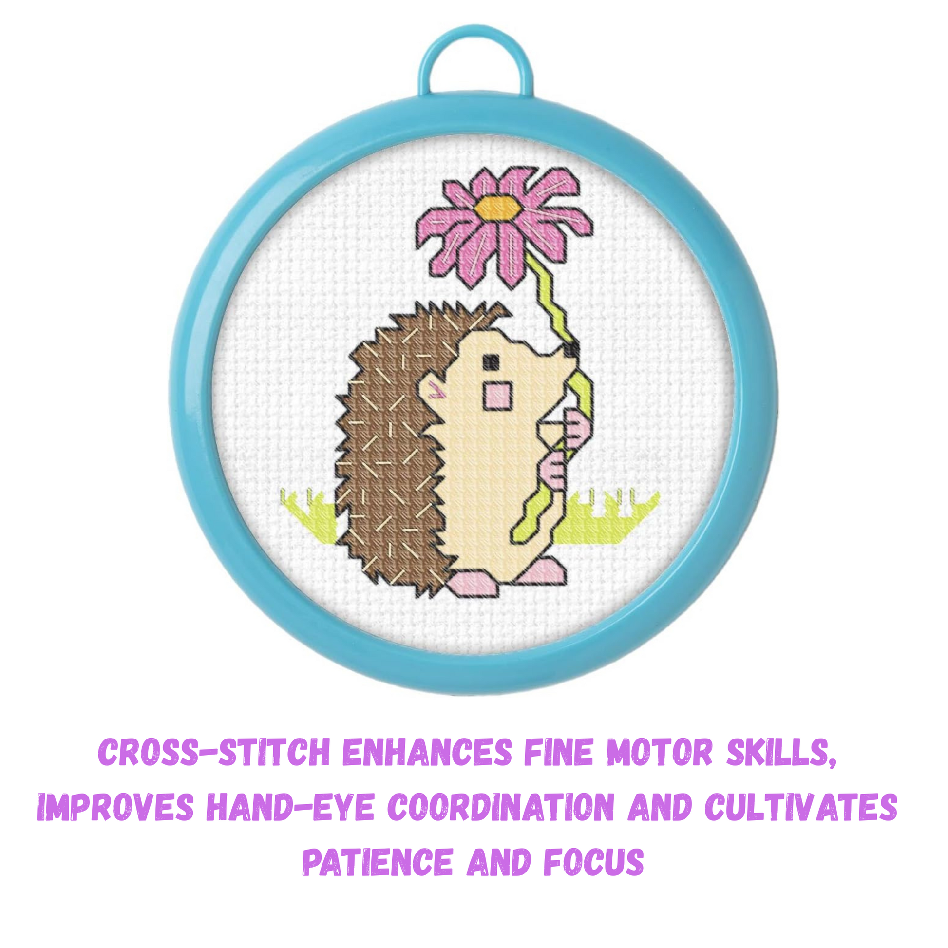 Counted Cross Stitch is a form of embroidery where you create a design by following a pattern and counting the stitches on a blank fabric using a design chart. This My First Stitch kit, featuring an adorable hedgehog design, is simple, and fun. A great introduction to this popular craft category. Basic X-shaped stitch, formed by two diagonal stitches, makes up the bulk of this project, making it a perfect start for school-age learners in or out of the classroom. Cross stitch requires precise hand-eye coordination to maneuver the needle and fabric.