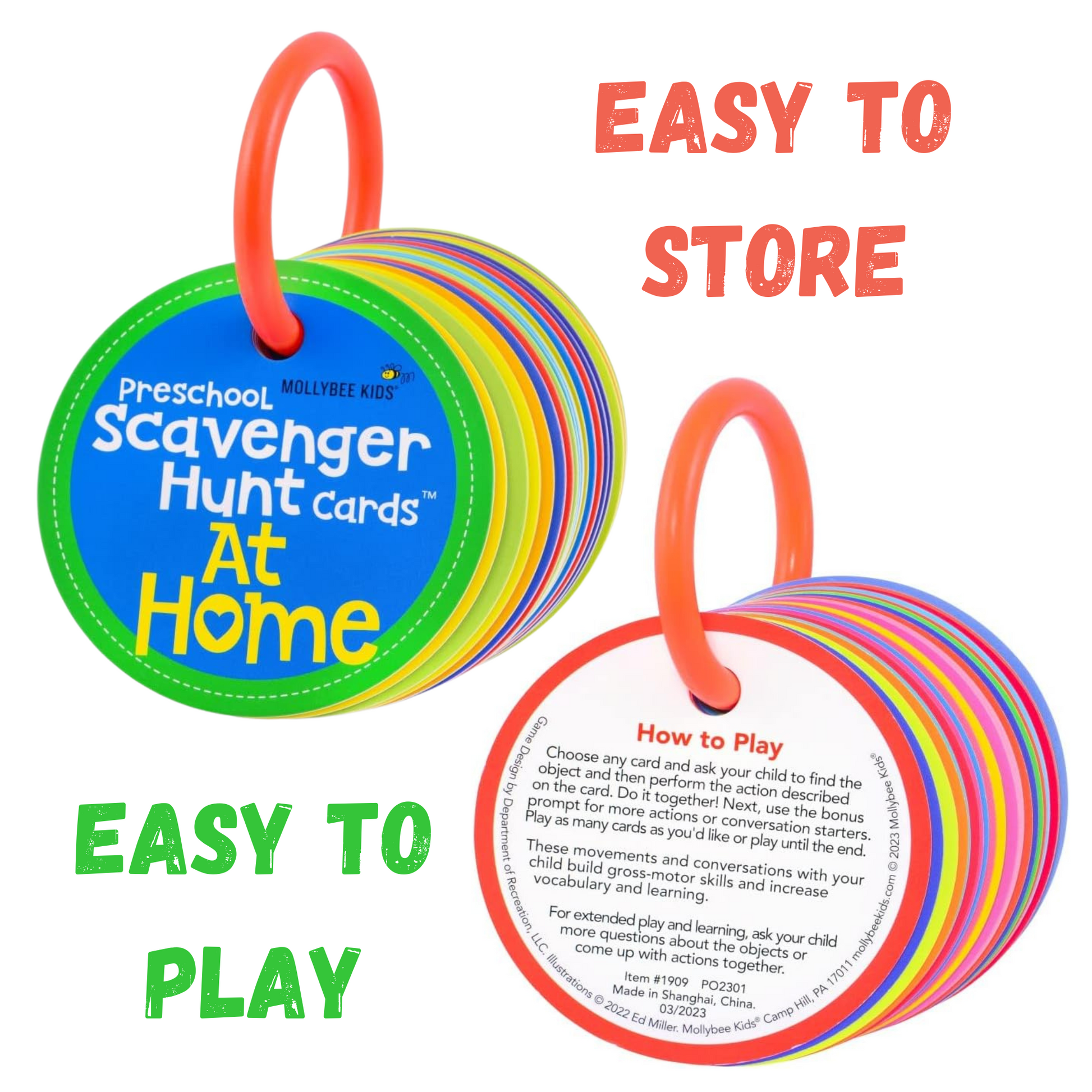 Scavenger Hunts with preschoolers are a great way to develop observation skills, problem-solving skills, and even collaboration and teamwork when they work together. With these cards you can turn your home into an exciting place for play and learning. When you must be indoors, this is a fun and engaging way to boost vocabulary and develop early creative thinking strategies.