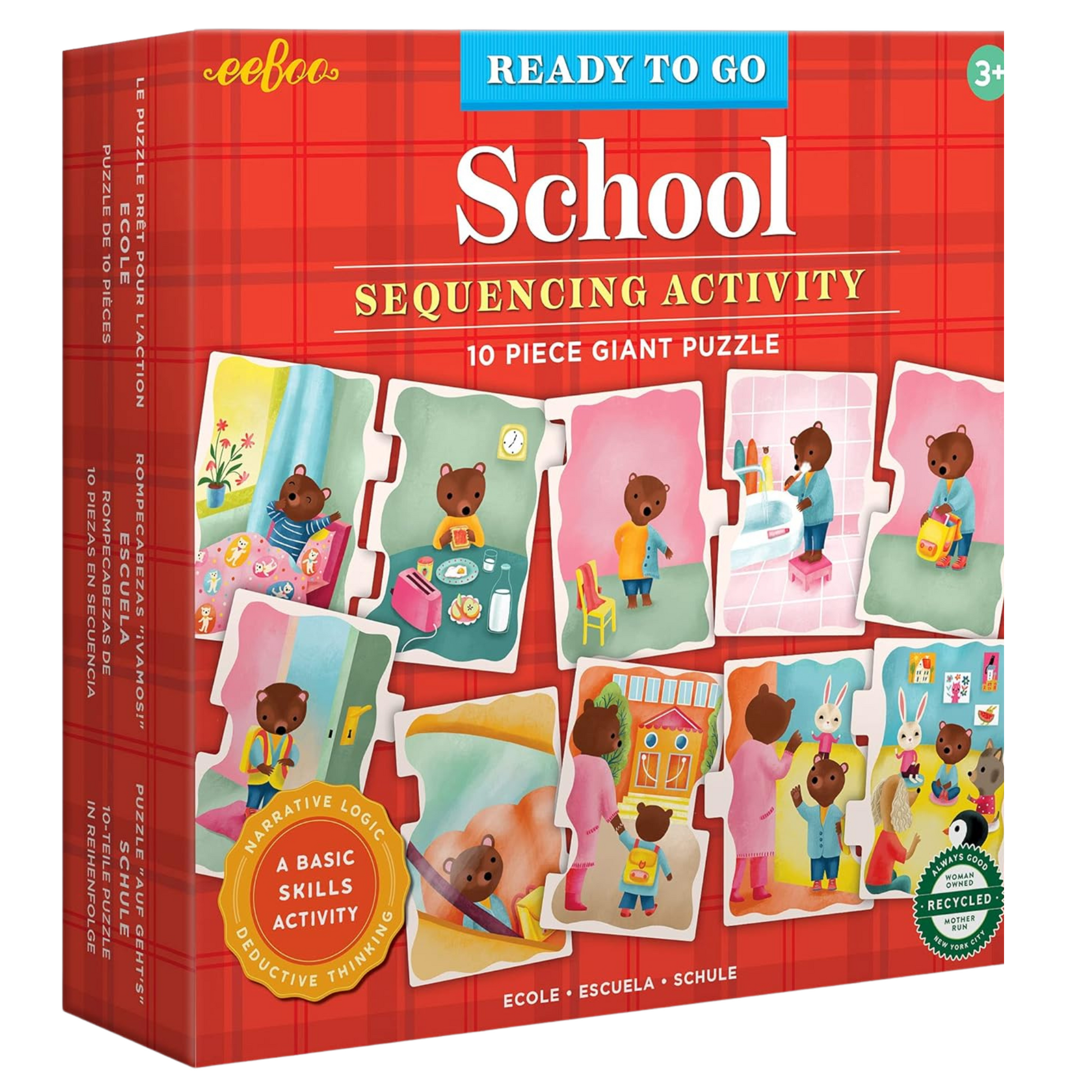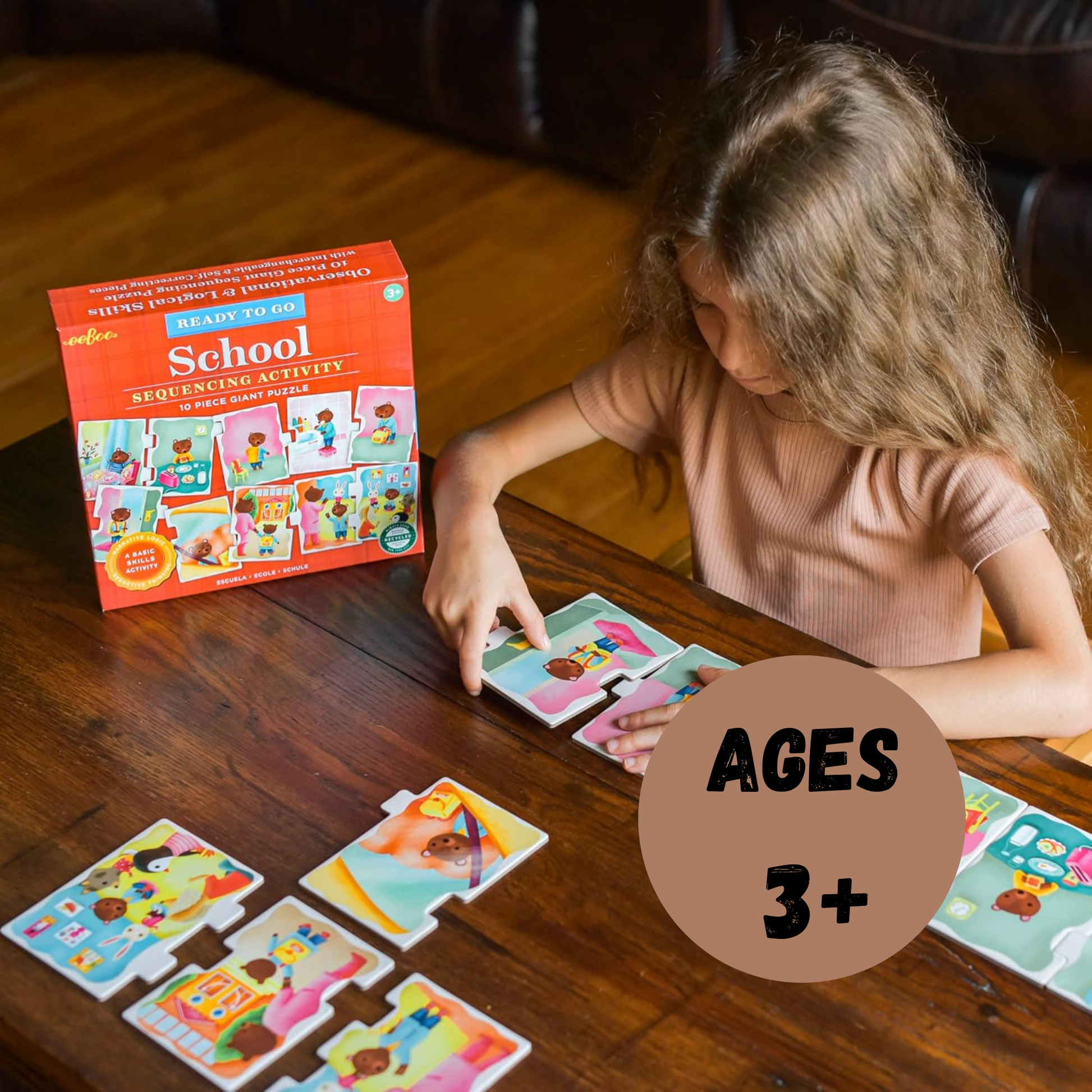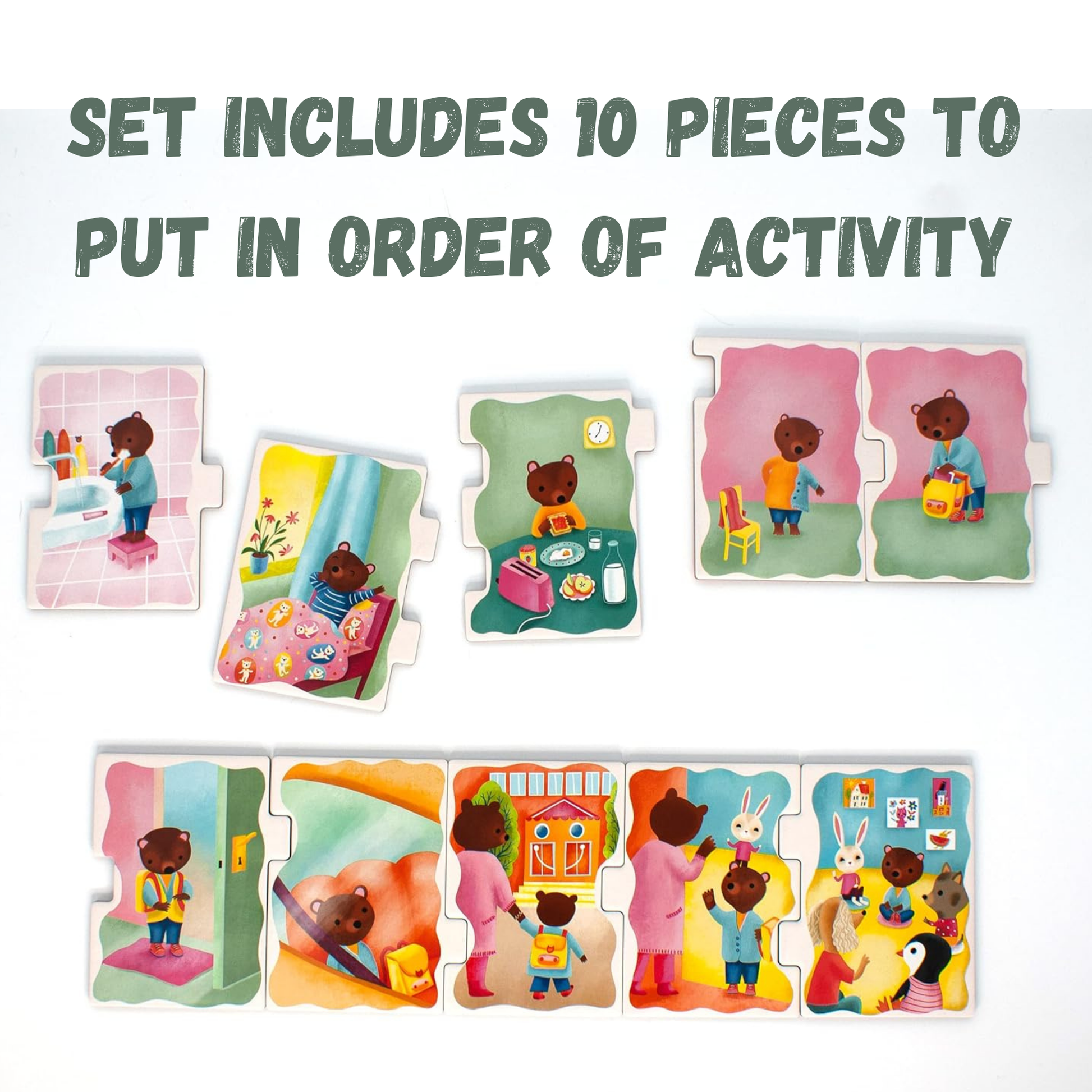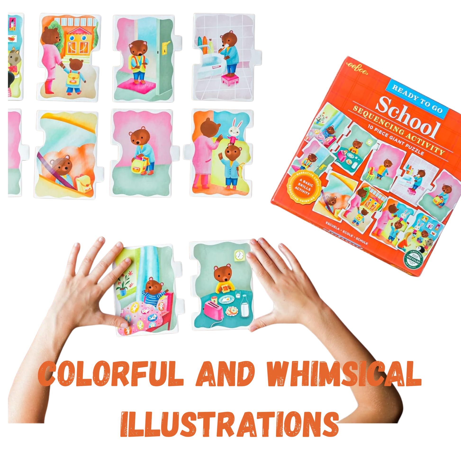 Getting ready for school can be full of challenges for our youngest learners until a routine is established. These Ready to Go School themed sequencing puzzles feature 10 thick pieces that illustrate a full school day agenda with getting up, traveling to school, lunch, playground fun and studies and other day activities to choose from. The oversized pieces make it satisfying for little hands to engage and arrange the order of action of these puzzles. Children place the interlocking pieces in the proper order, noticing logical hints in the charming illustrations, but not every piece is self-correcting to provide for some challenge.