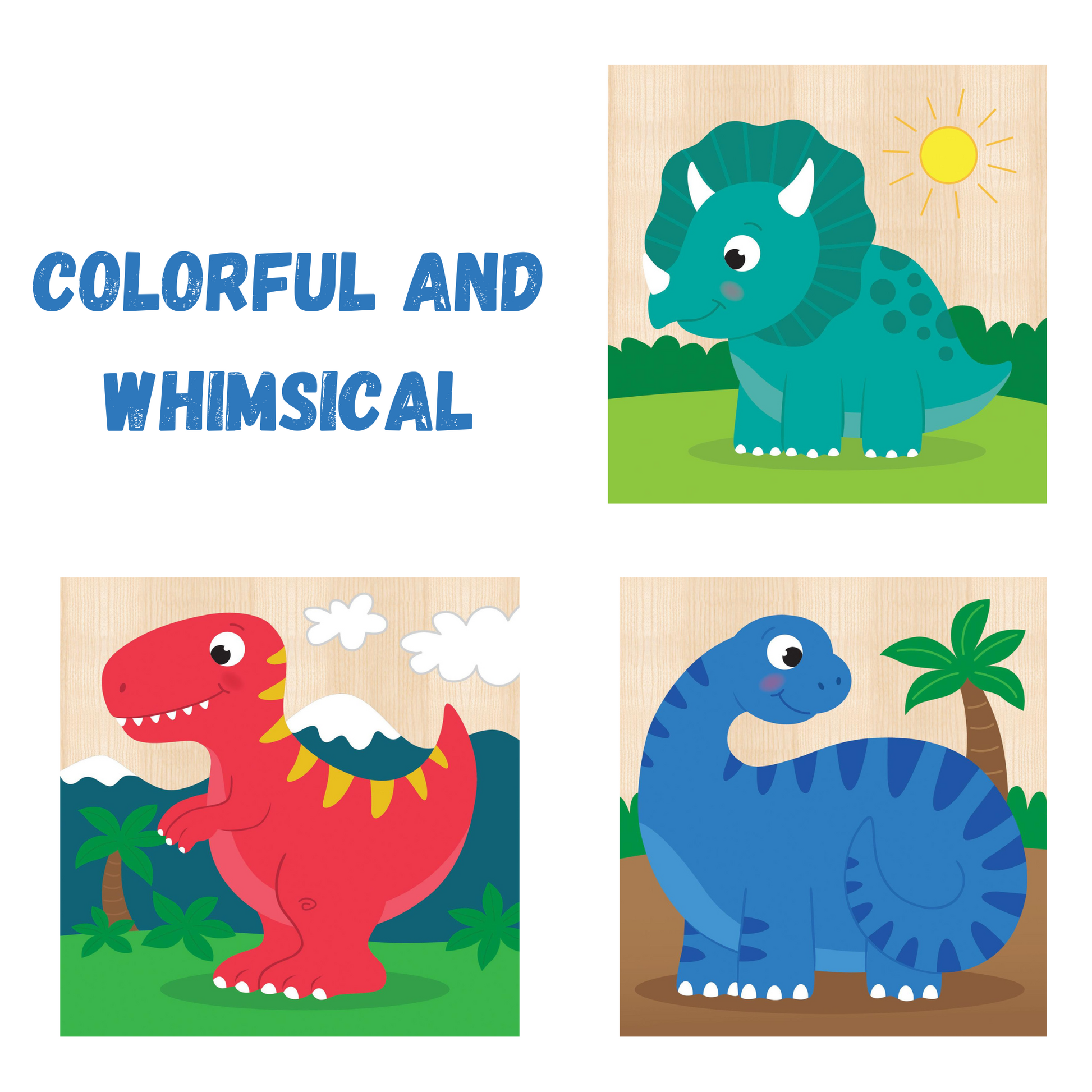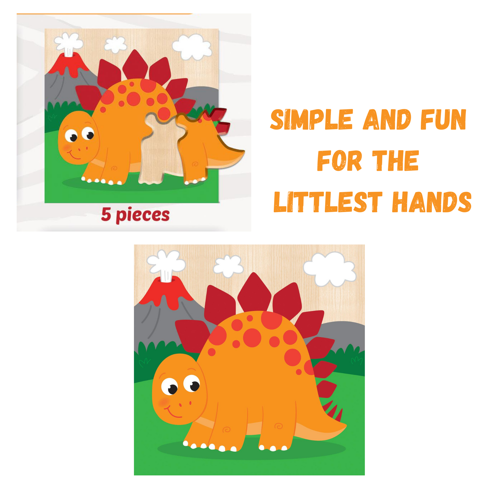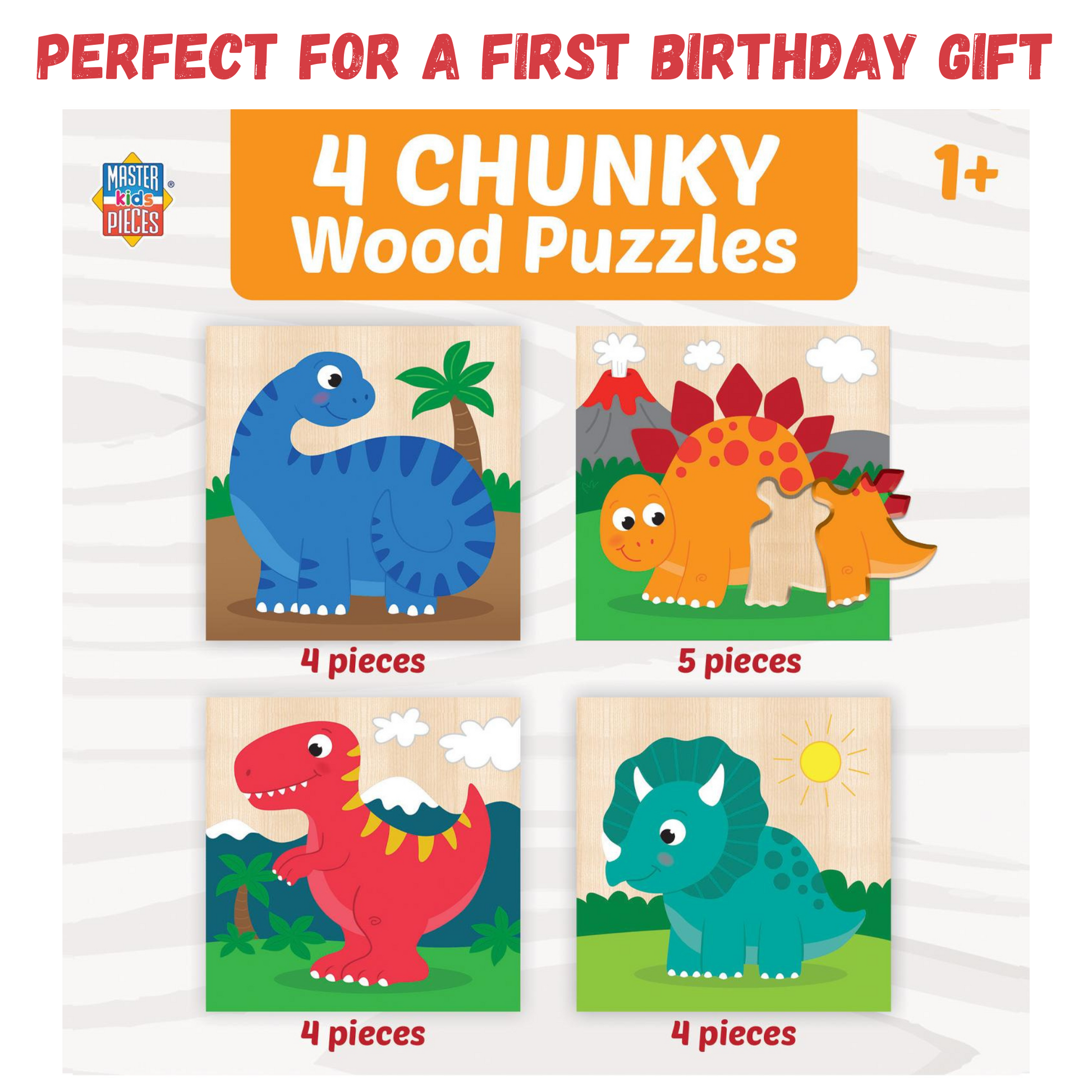 Captivate a young imagination, ignite a sense of adventure and foster valuable development skills with this colorful and whimsical dinosaur chunky puzzle set. These delightful wooden jigsaw puzzles are perfect for young children ages 1 and up and make for a great 1st Birthday gift idea. Each puzzle features a different dinosaur-themed image, including Brontosaurus, T-Rex, Triceratops and Stegosaurus. With chunky pieces that are easy to grip, these puzzles are designed to help develop the child's fine motor skills. This set includes four puzzles with a total of 4 or five pieces in each. A great introduction to the world of puzzles.
