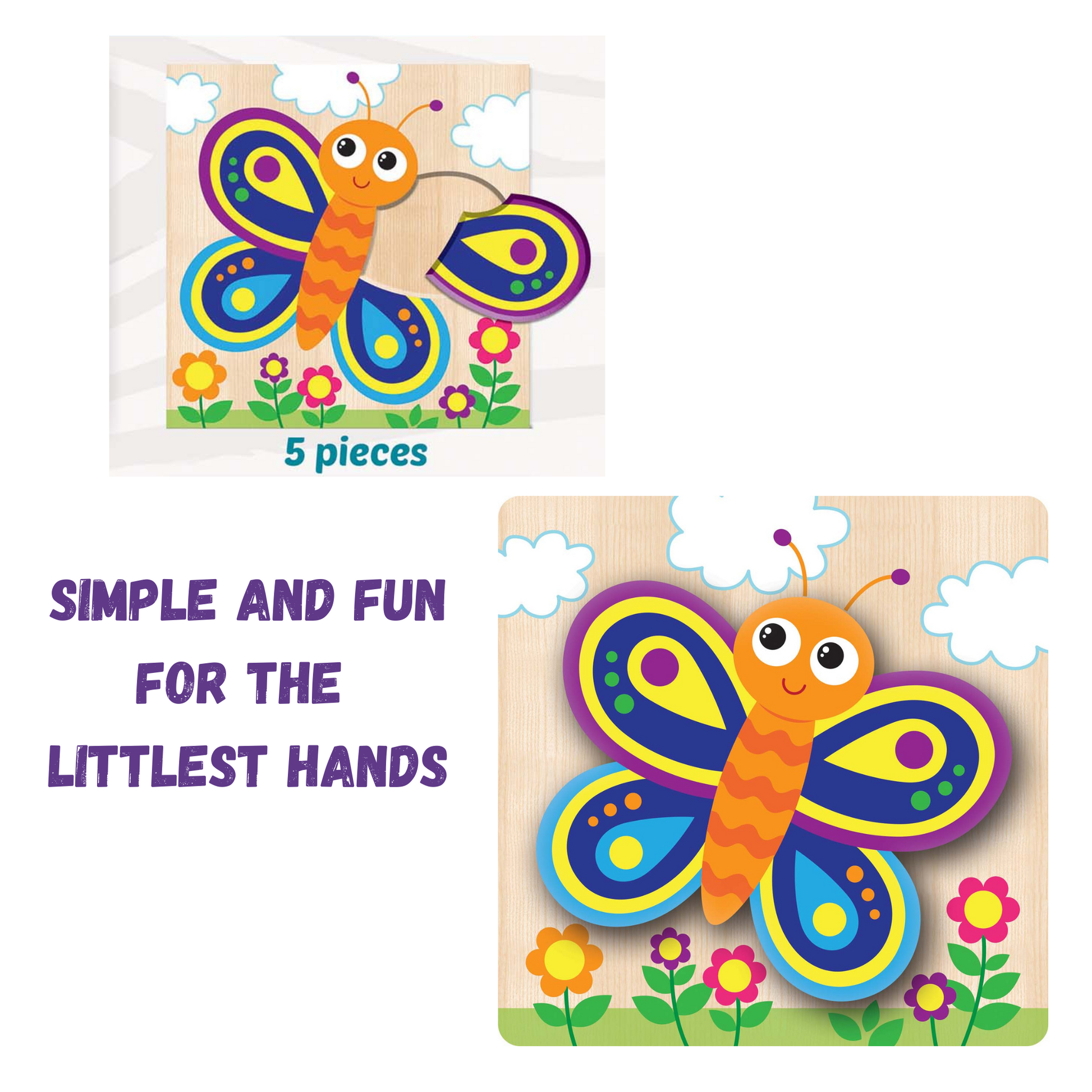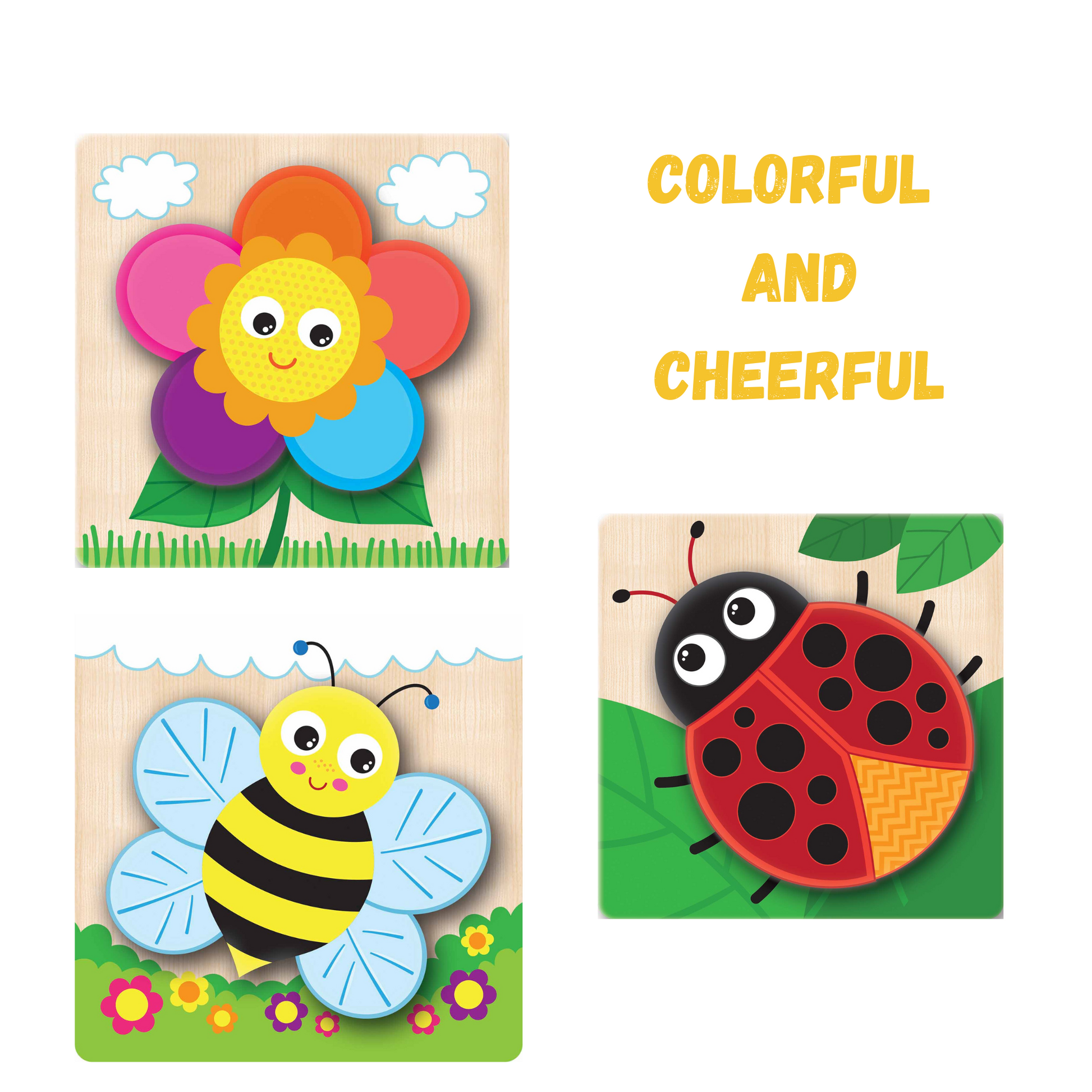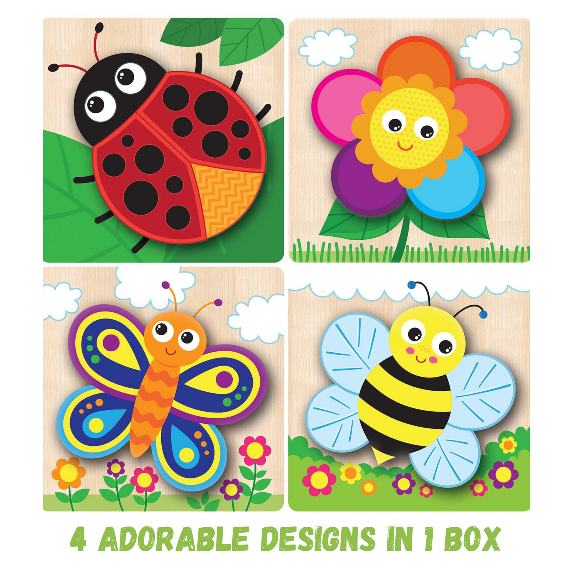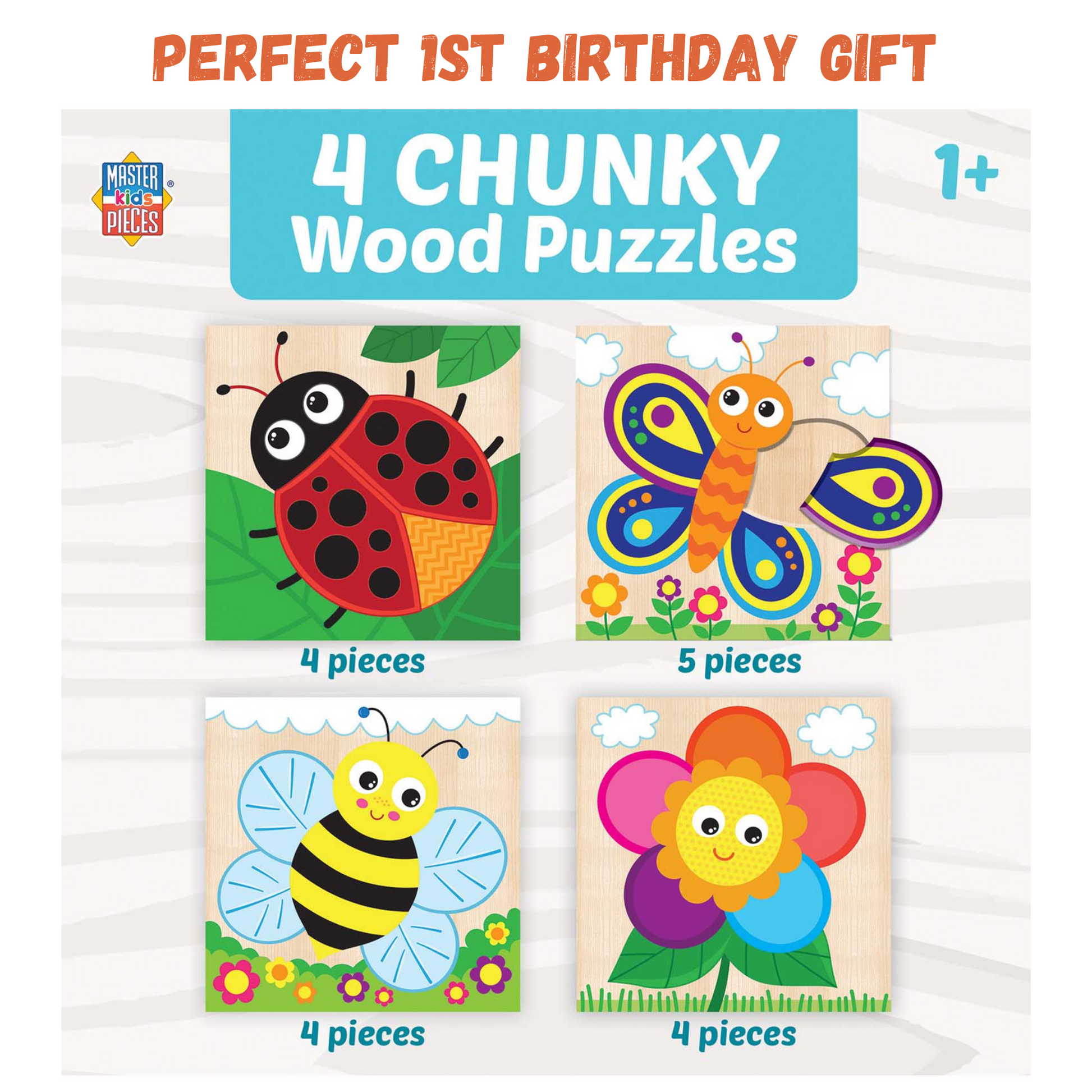 Get ready for a garden adventure with these 4 Garden Friends Chunky Wood Puzzles. These delightful wooden jigsaw puzzles are perfect for young children ages 1 and up and make for a great 1st Birthday gift idea. Each puzzle features a different garden-themed image, including a colorful butterfly, a flower and insects. With chunky pieces that are easy to grip, these puzzles are designed to help develop the child's fine motor skills. This set includes four puzzles with a total of 4 or five pieces in each. A great introduction to the world of puzzles.
