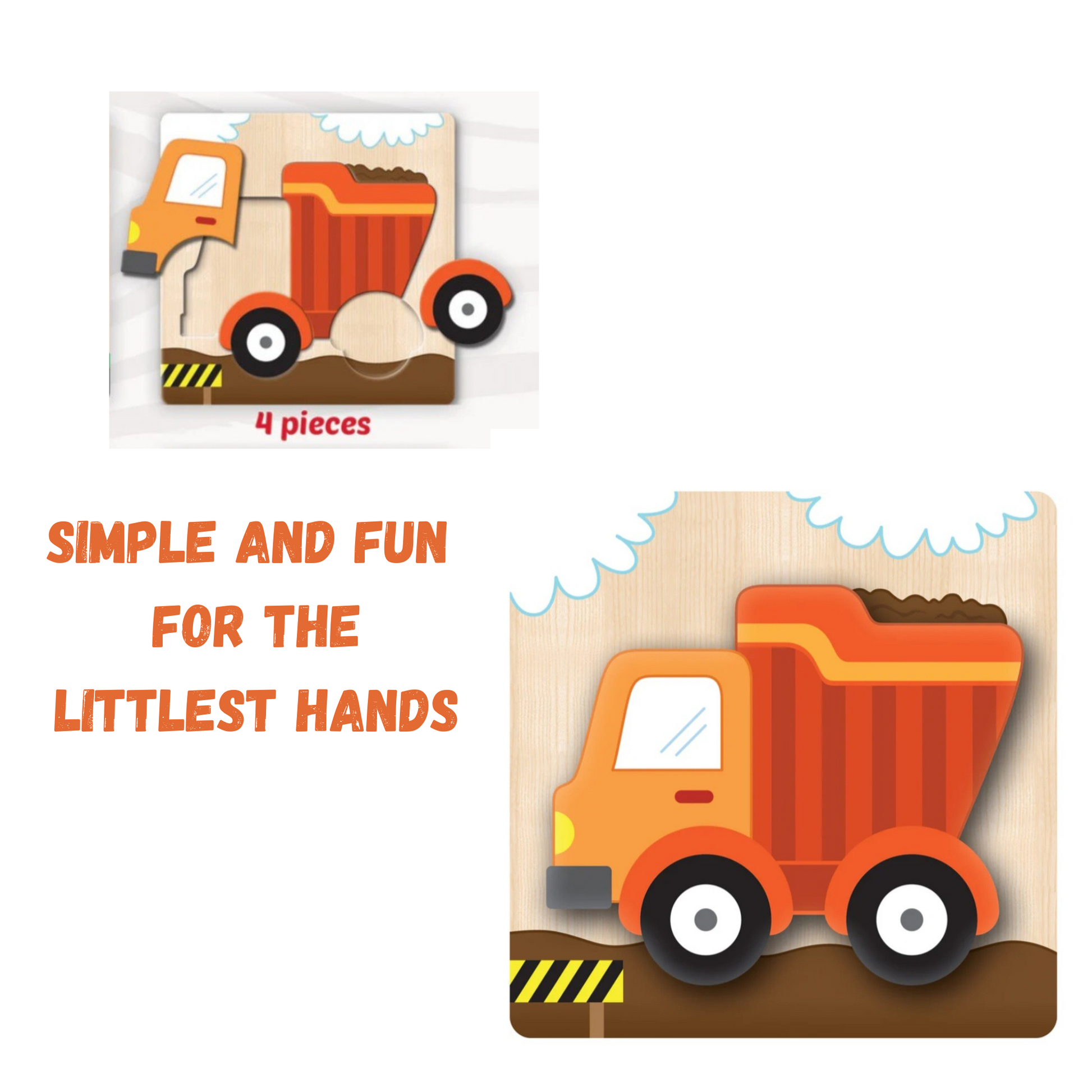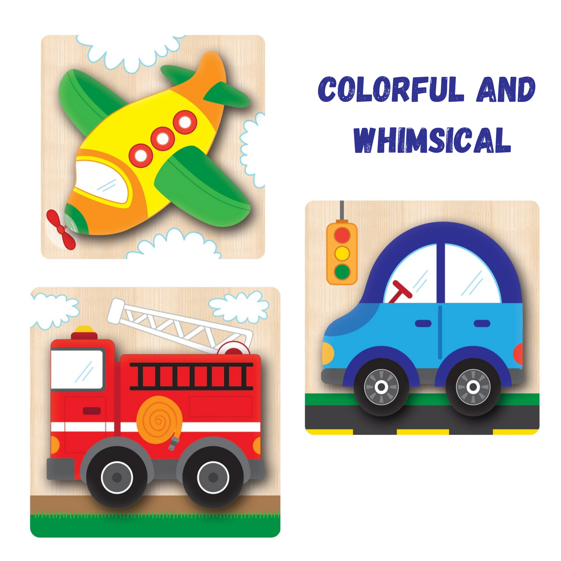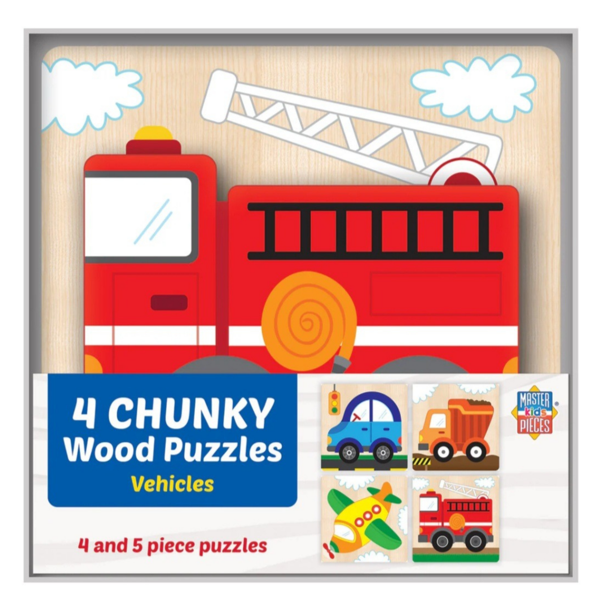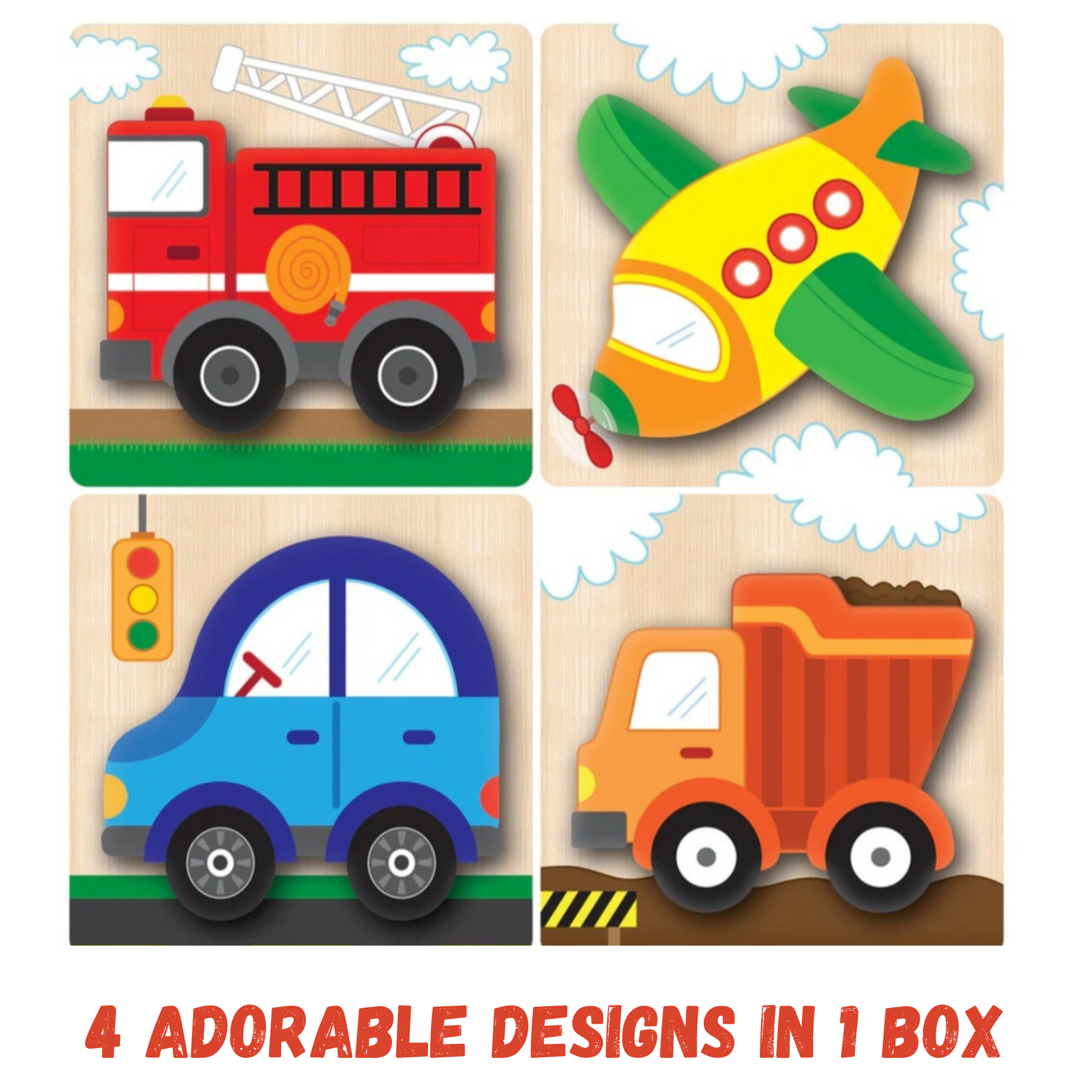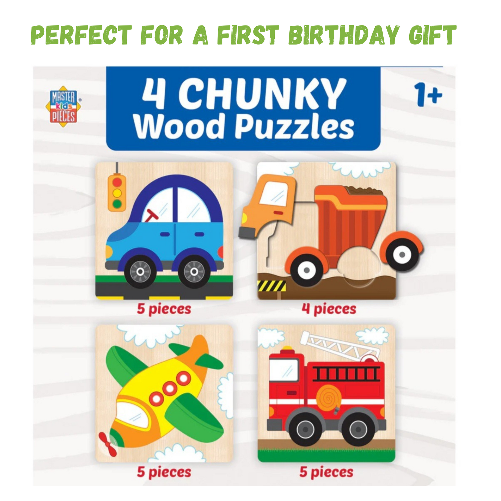 Get ready for an adventure in transportation with these 4 Vehicles Chunky Wood Puzzle Set. These delightful wooden jigsaw puzzles are perfect for young children ages 1 and up and make for a great 1st Birthday gift idea. Each puzzle features a different colorful vehicle image, including a firetruck, car, airplane, and dump truck. With chunky pieces that are easy to grip, these puzzles are designed to help develop the child's fine motor skills. This set includes four puzzles with a total of 4 or five pieces in each. A great introduction to the world of puzzles.