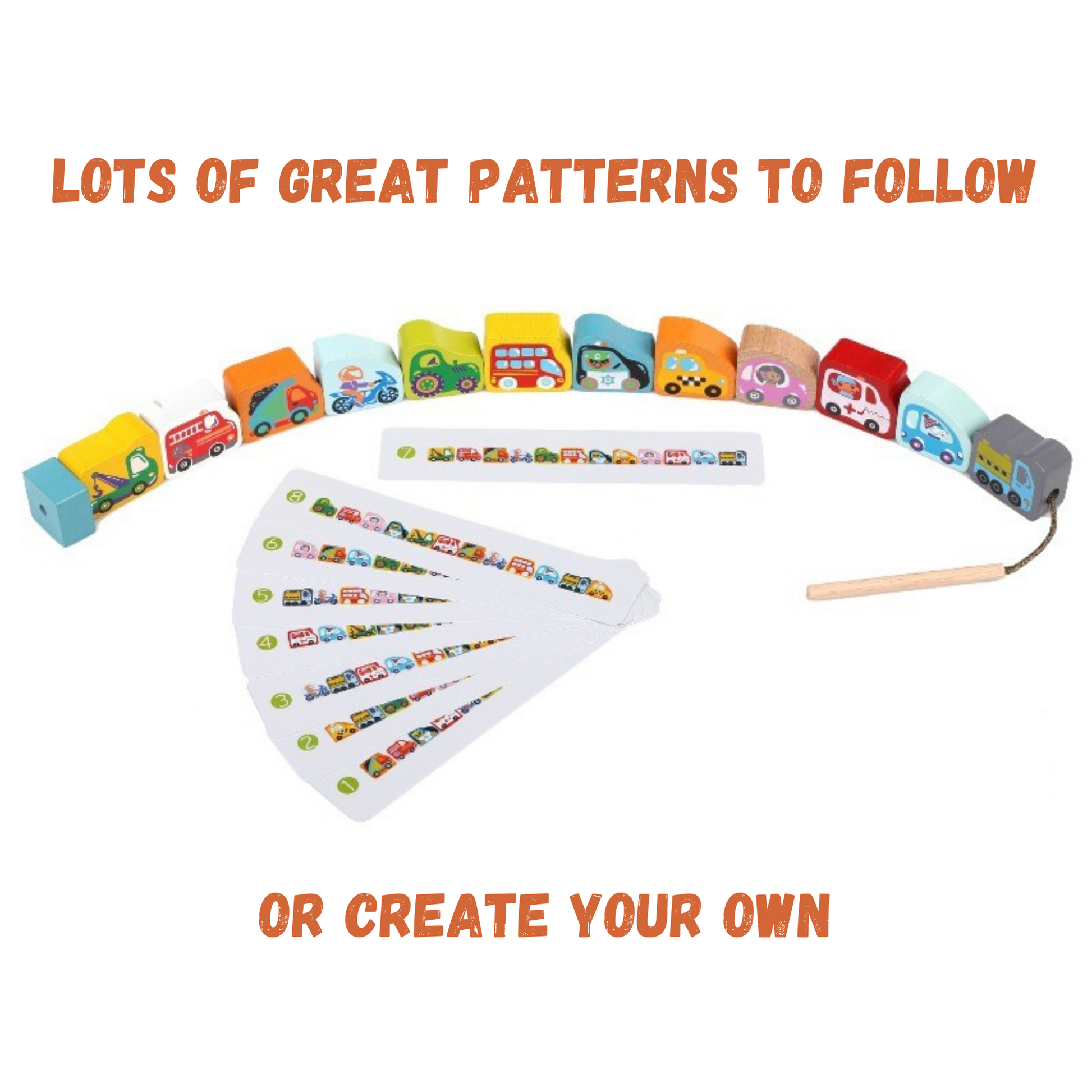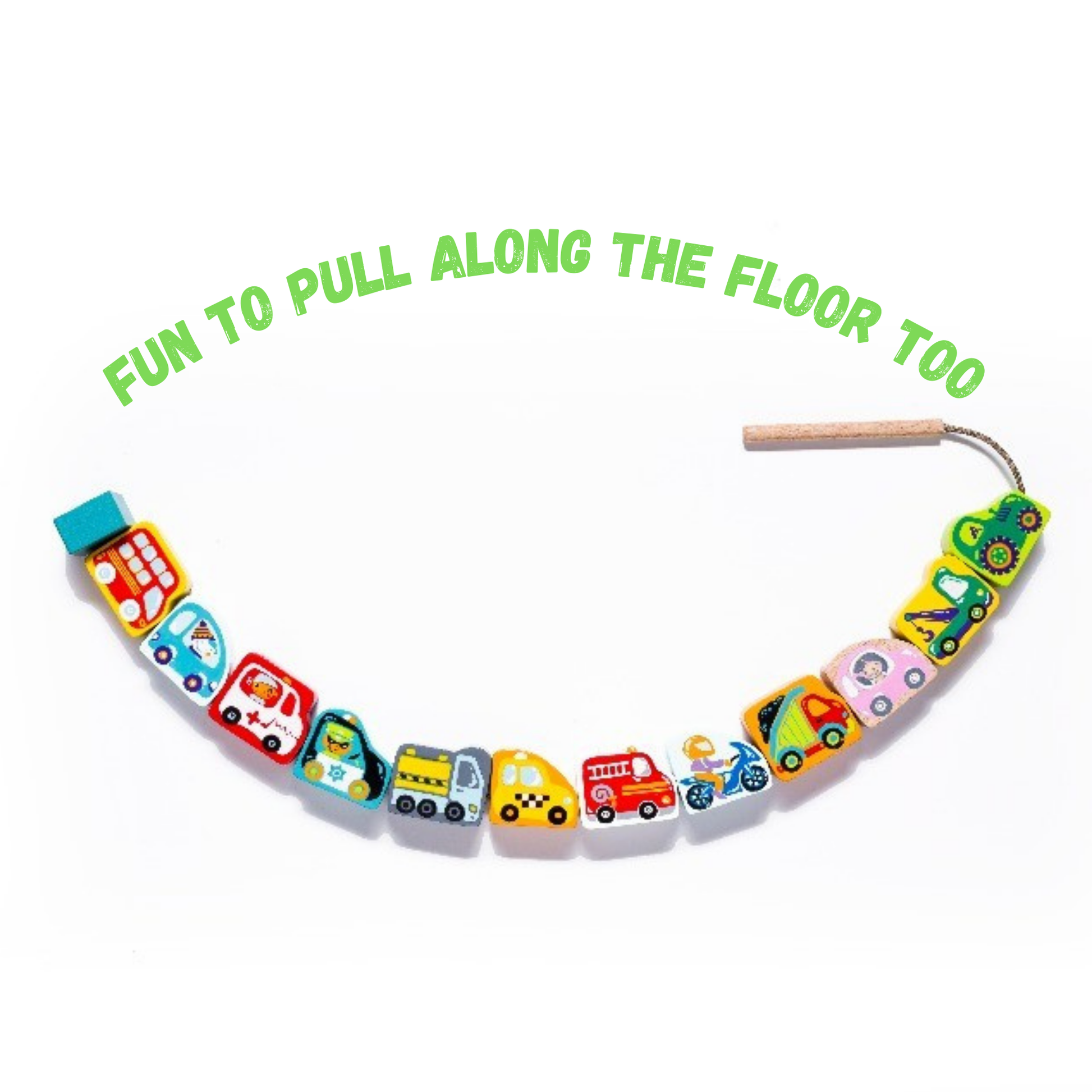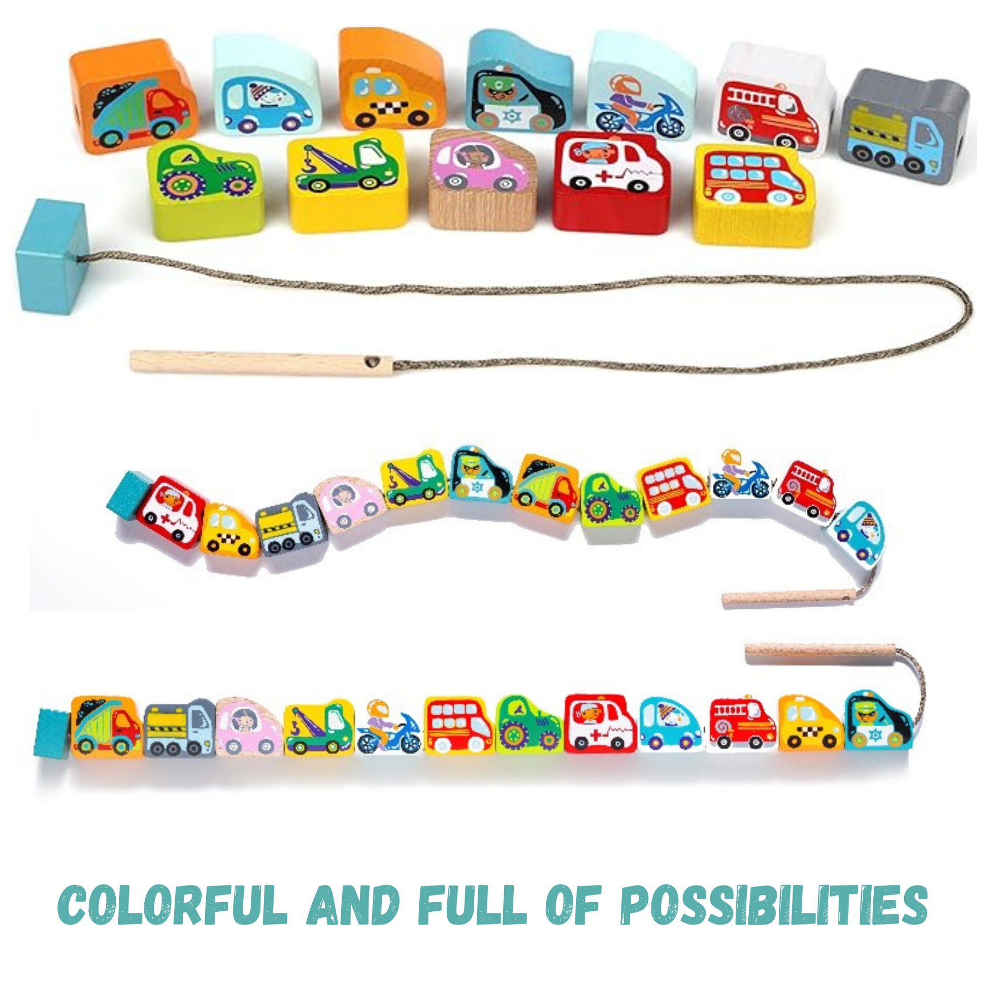 - Set includes 12 wooden vehicle blocks in bright colors and string with one end as threader and other end as the stopping block.